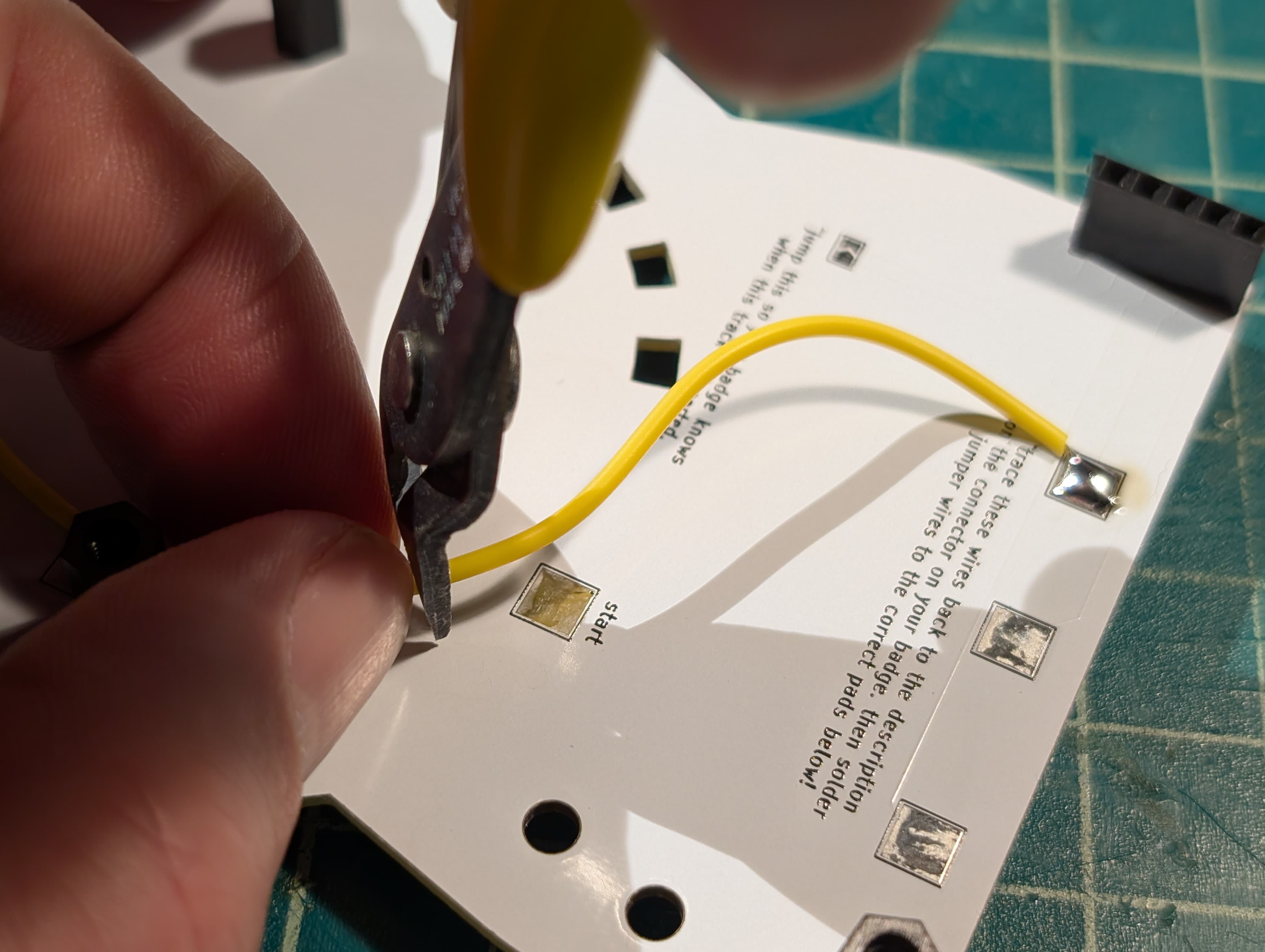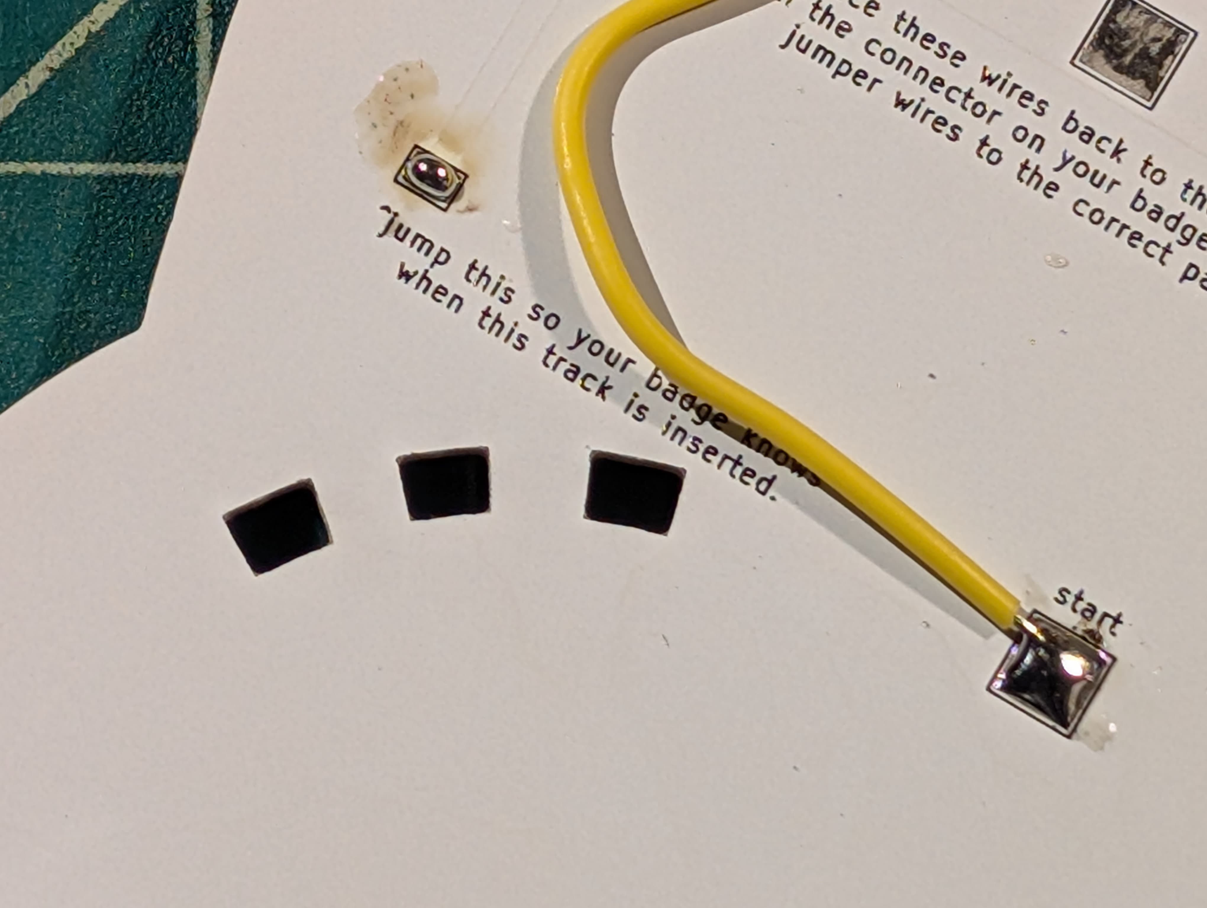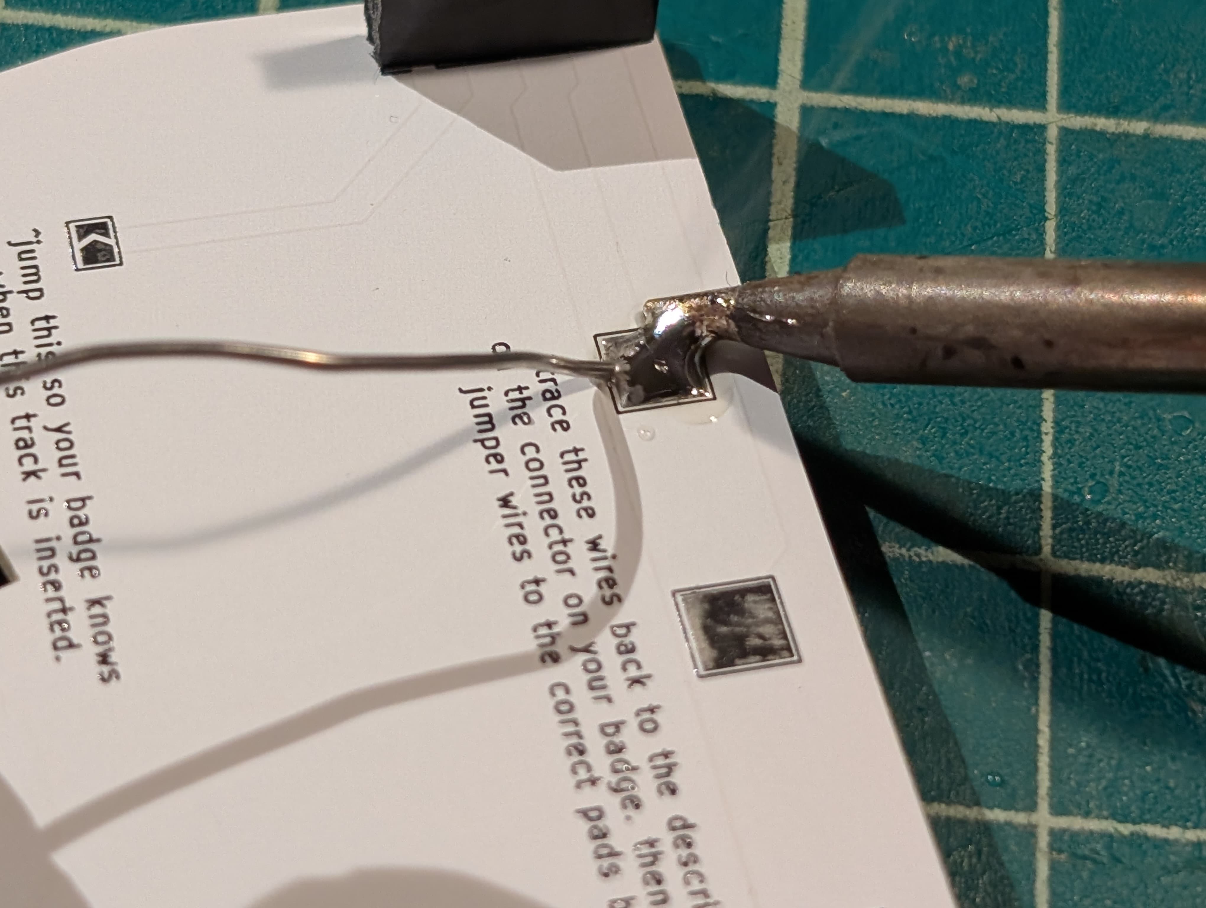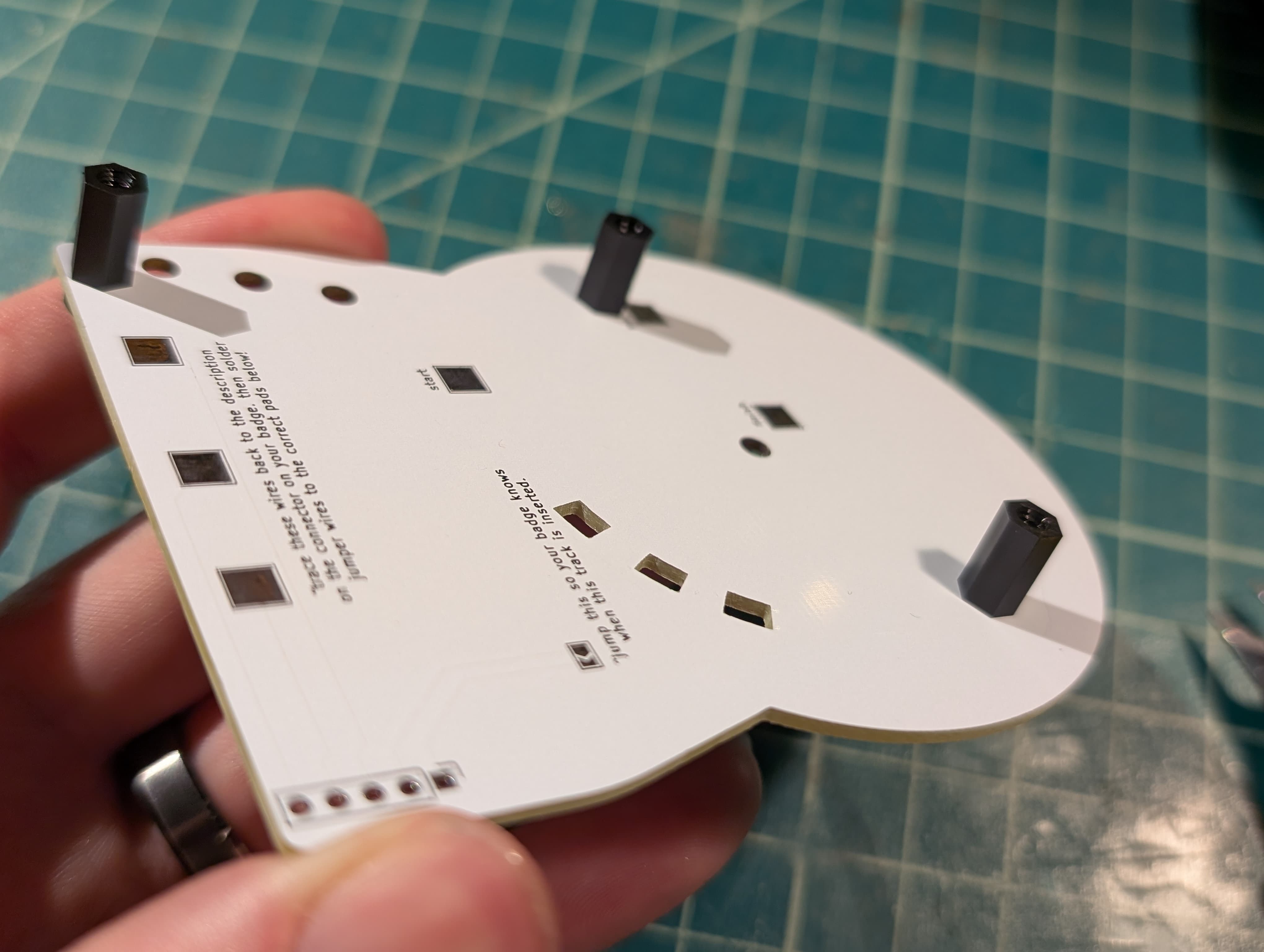 Last step! Time for tracing and jumper wires. Take a look at the back of the bonus track, there are some pads along the top. You need to follow their traces on the PCB, through the header, and to the badge PCB where they are labeled. Once you figure out what goes where, you can solder jumper wires!