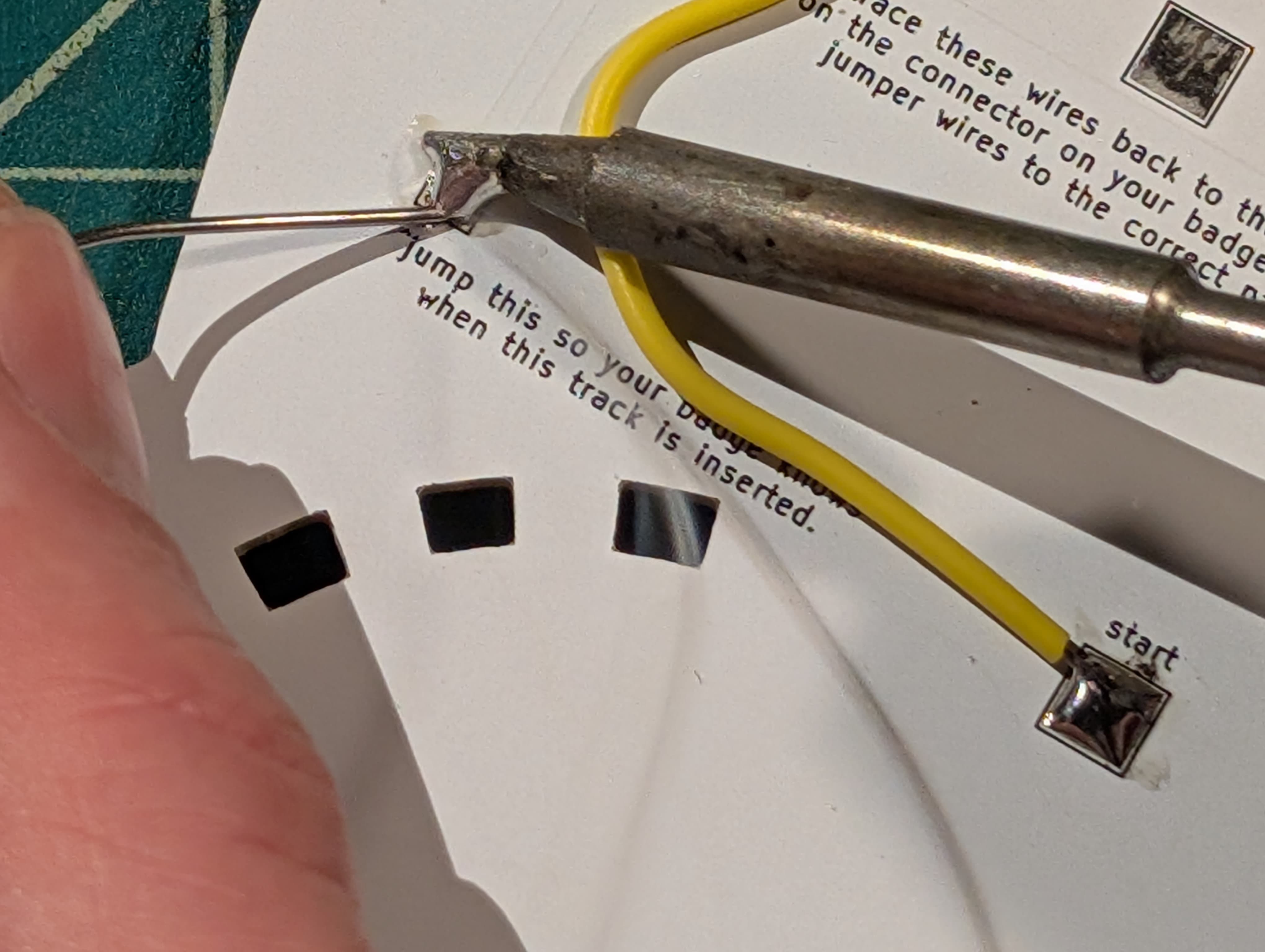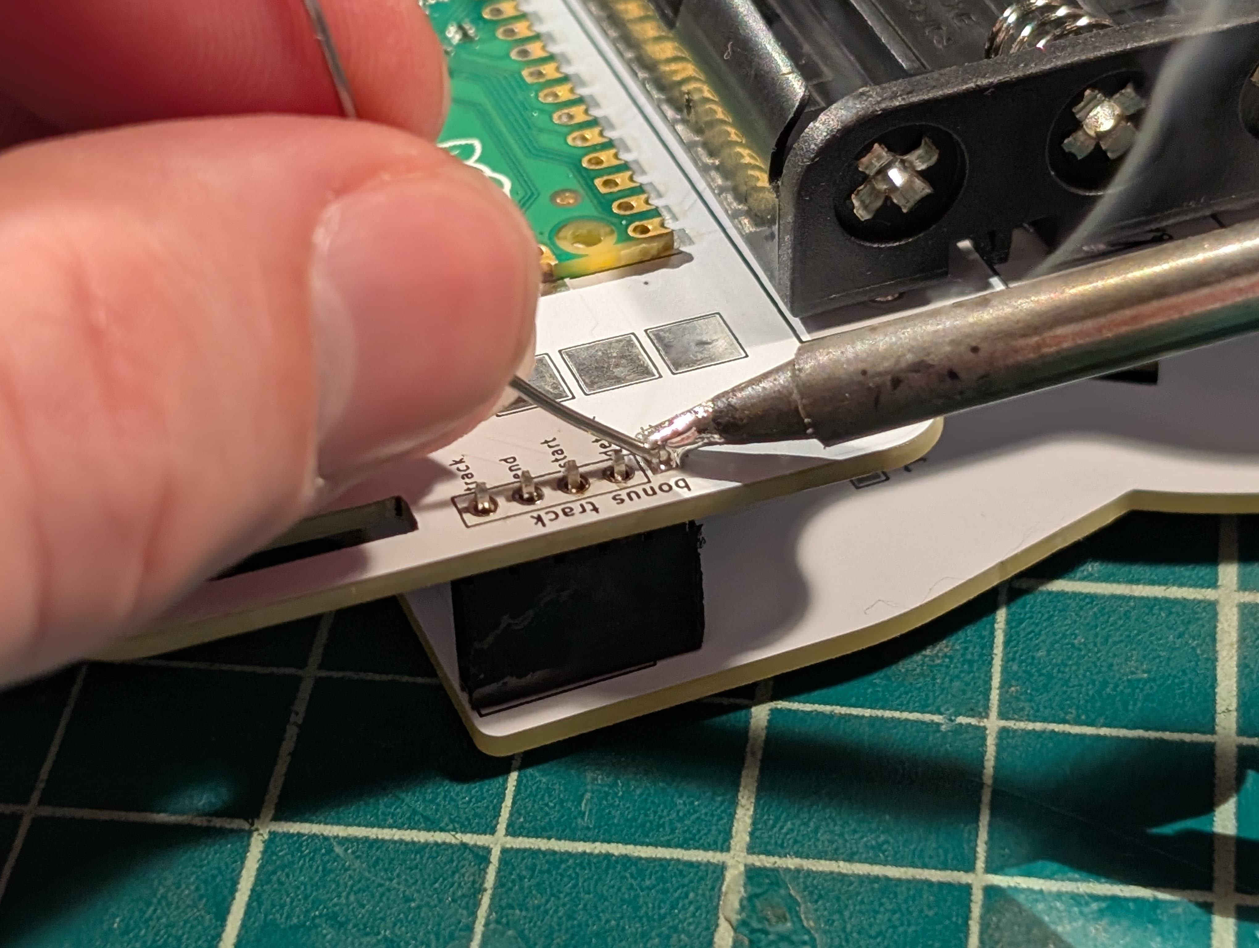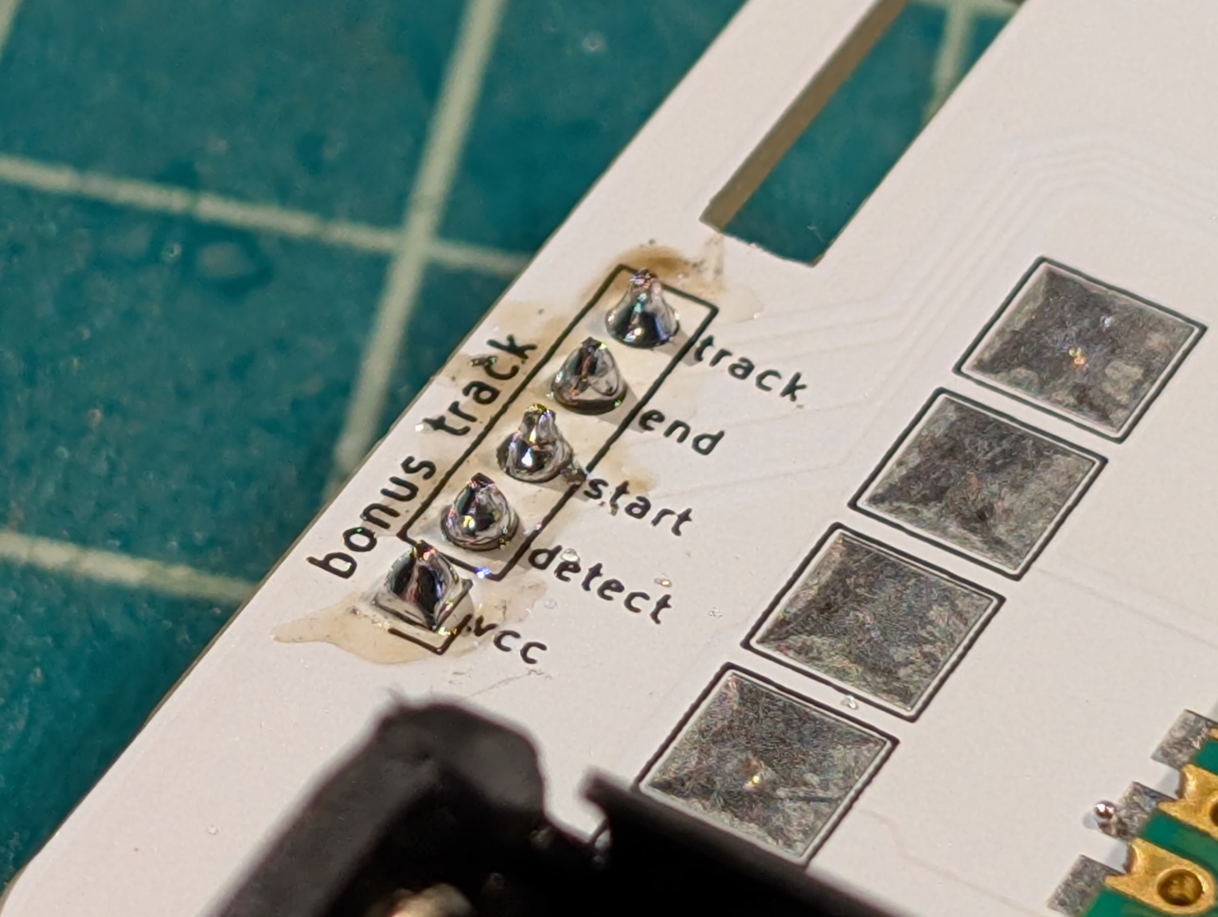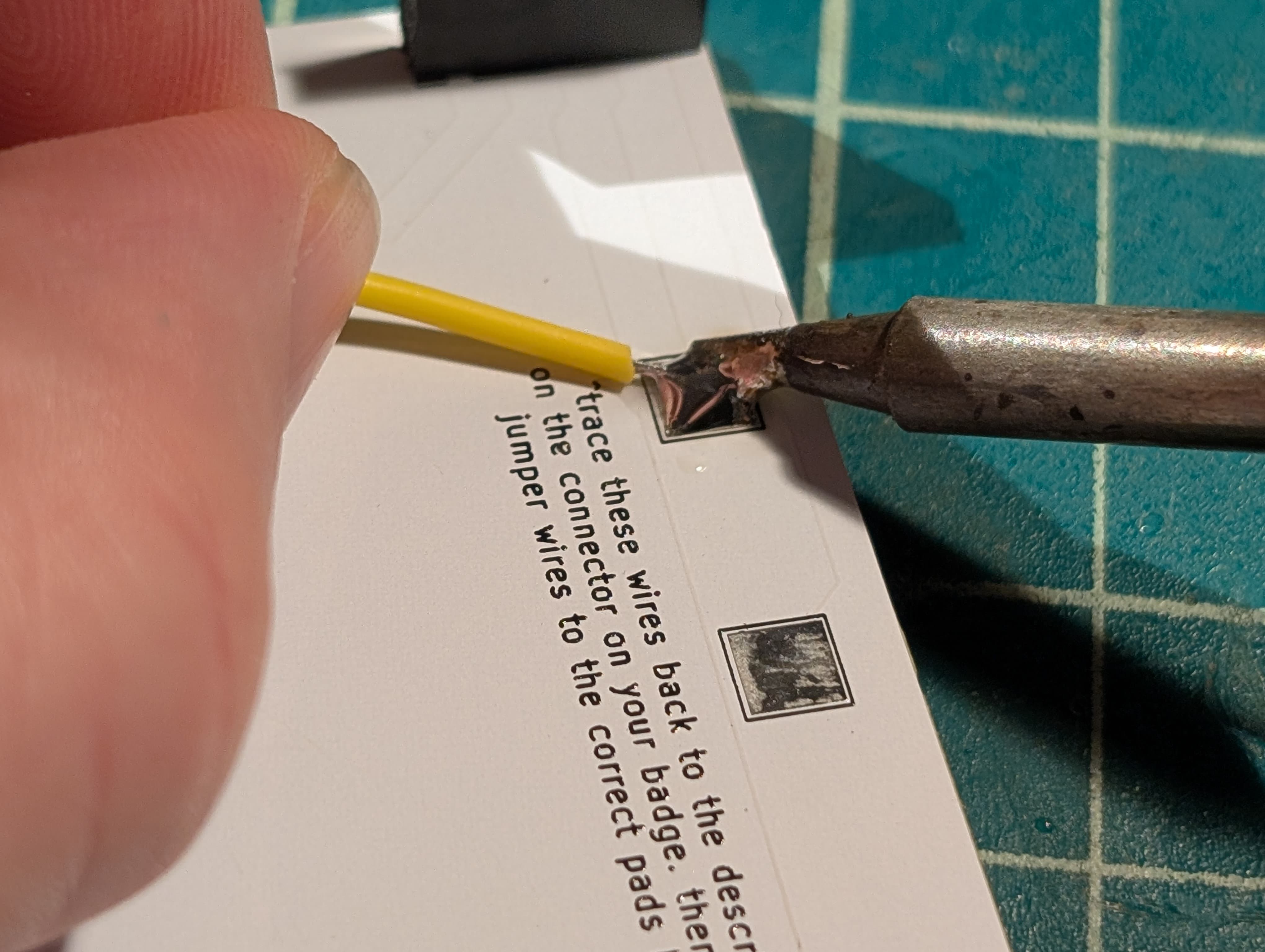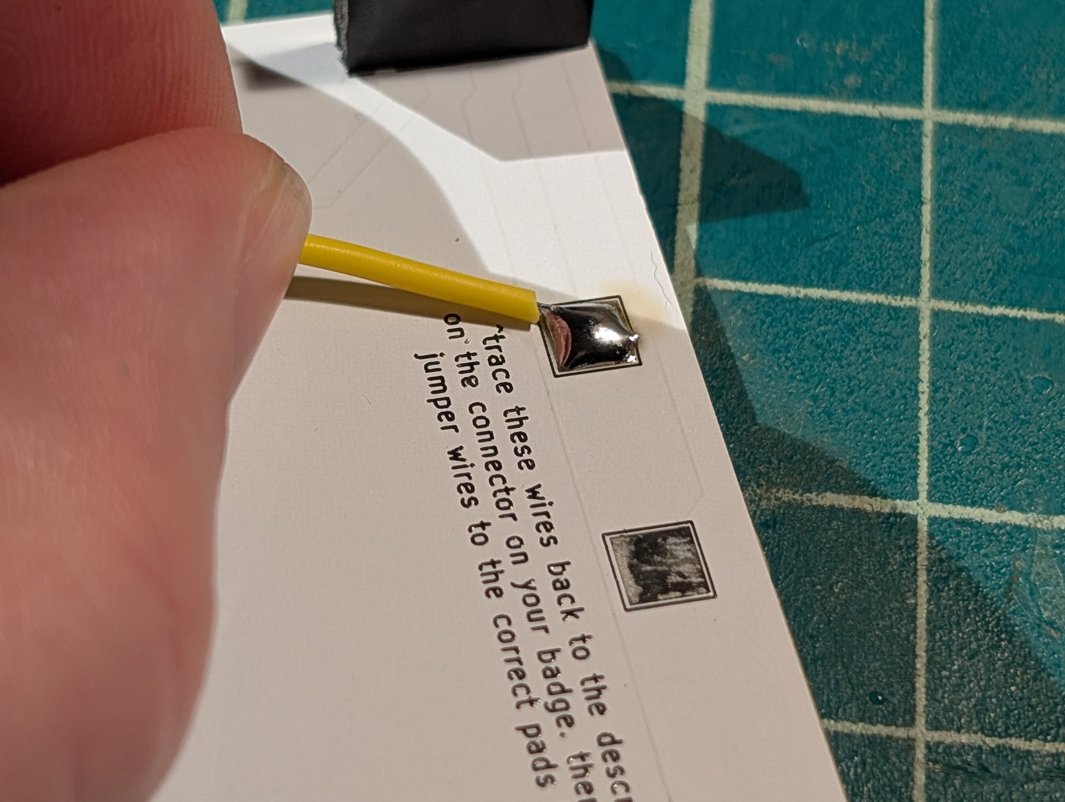 Last step! Time for tracing and jumper wires. Take a look at the back of the bonus track, there are some pads along the top. You need to follow their traces on the PCB, through the header, and to the badge PCB where they are labeled. Once you figure out what goes where, you can solder jumper wires!