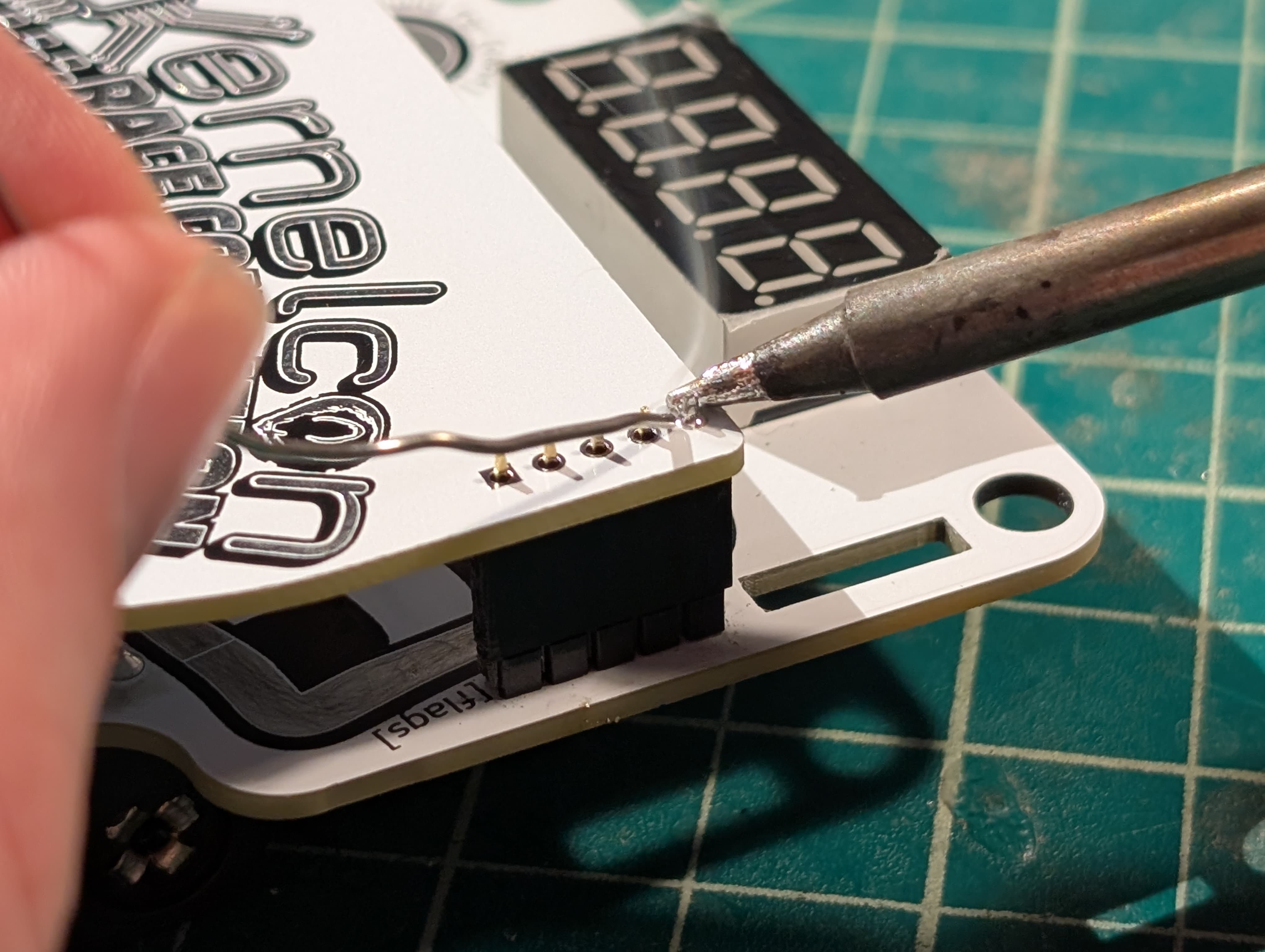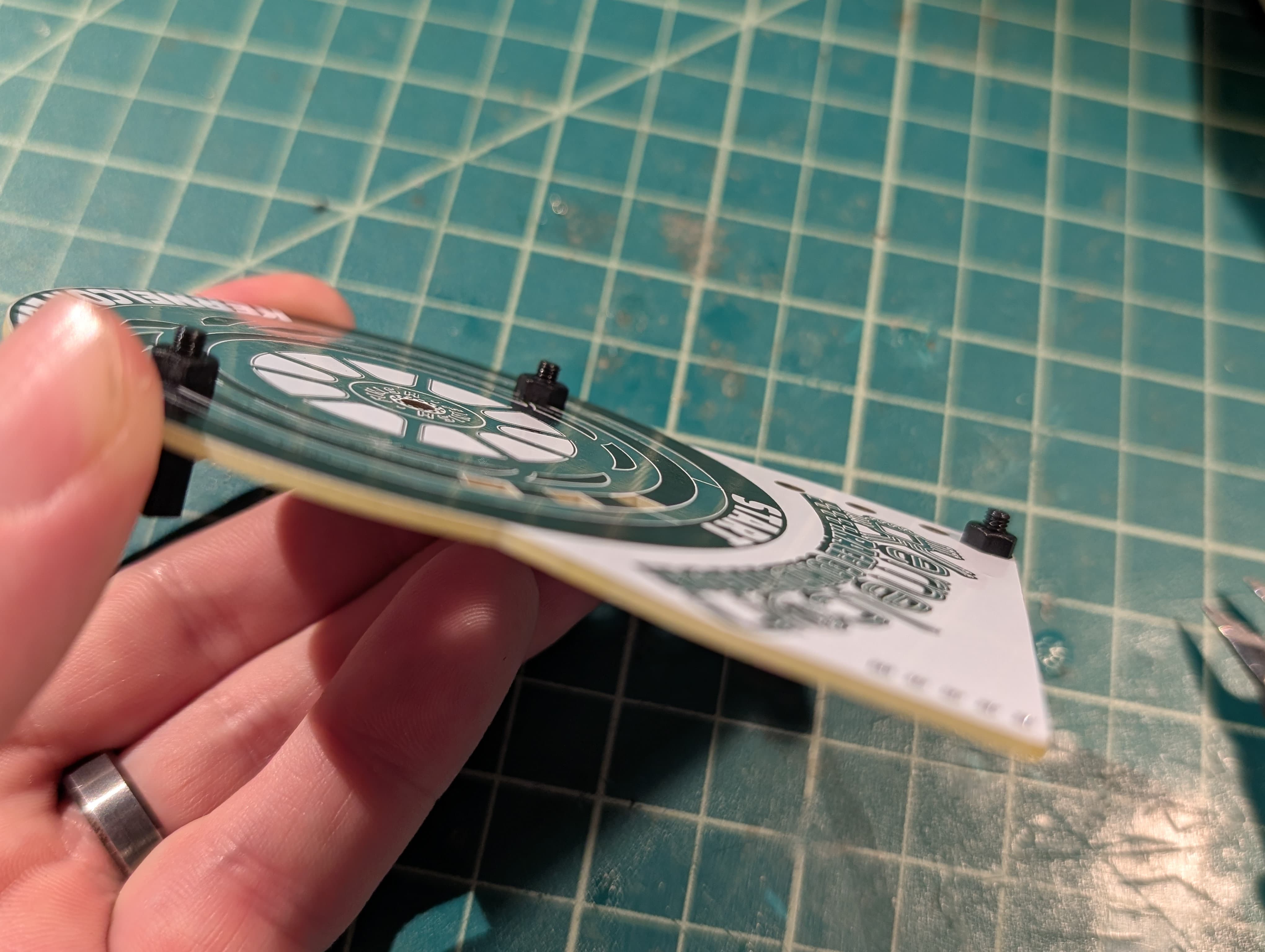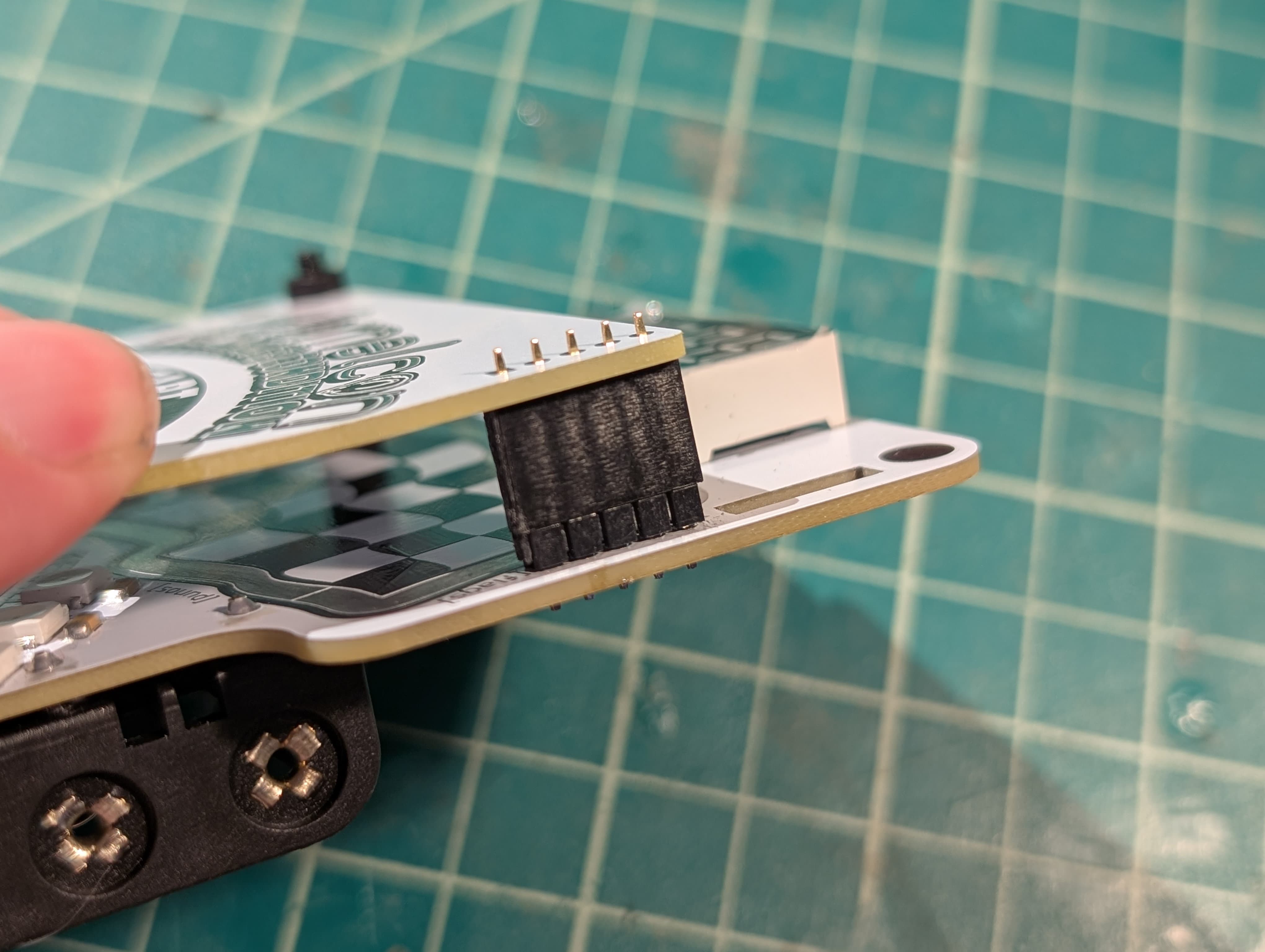 Now insert the assemble into the pin holes on both the bonus track PCB and badge PCB. I have the male side on the badge PCB, but either way works!