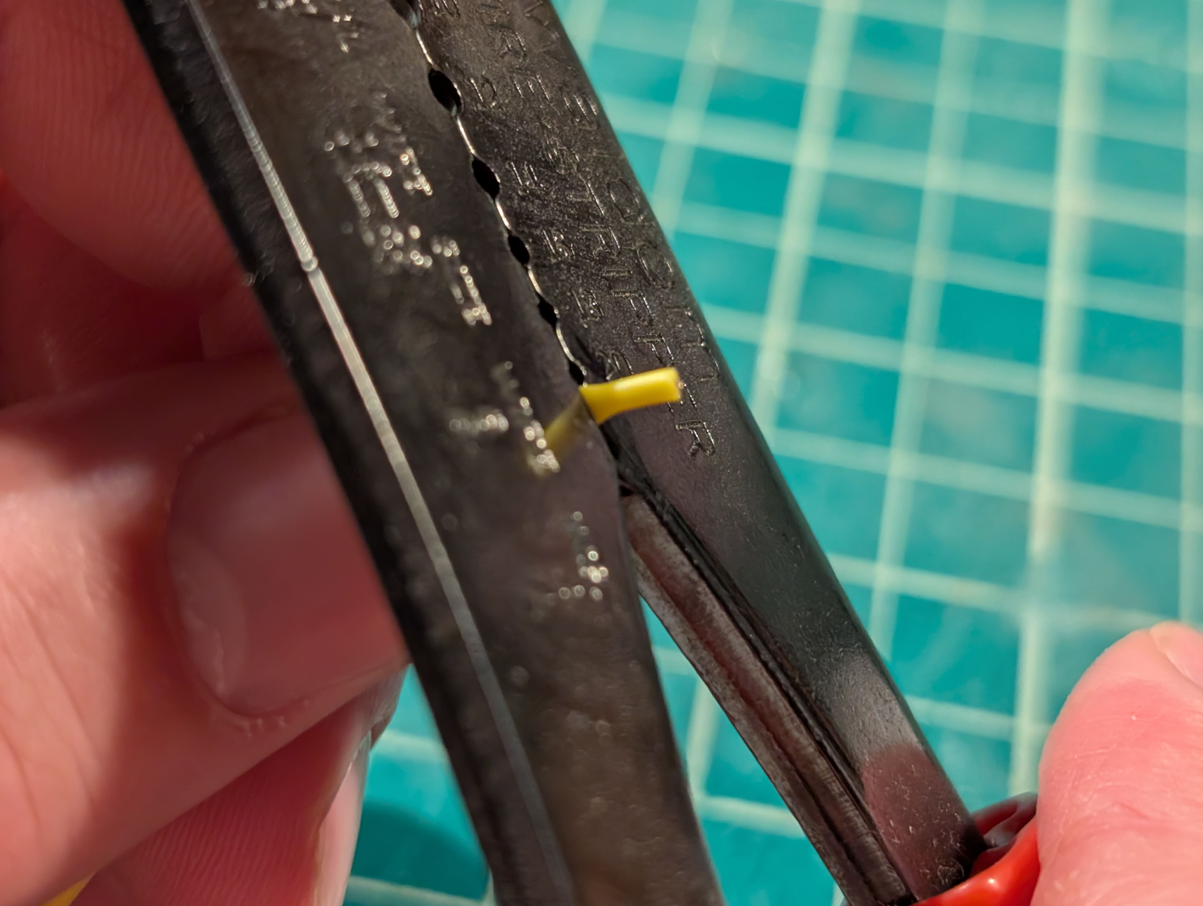 Once you figure out where a jumper wire needs to be, we first strip the wire. Take the wire strippers, open them, place the wire in the 22 AWG hole, close them, and pull away! This will strip shielding off and expose bare wire!