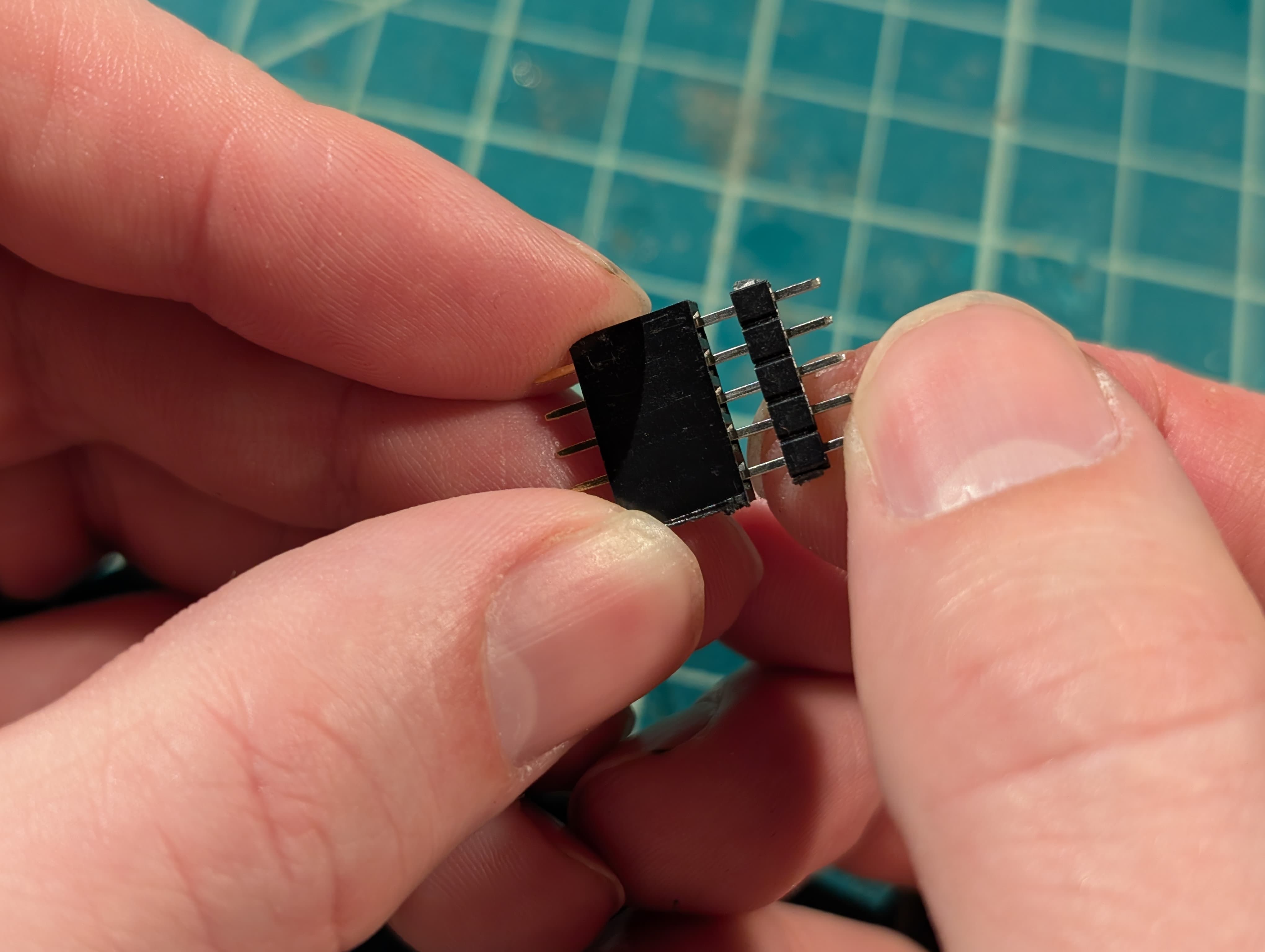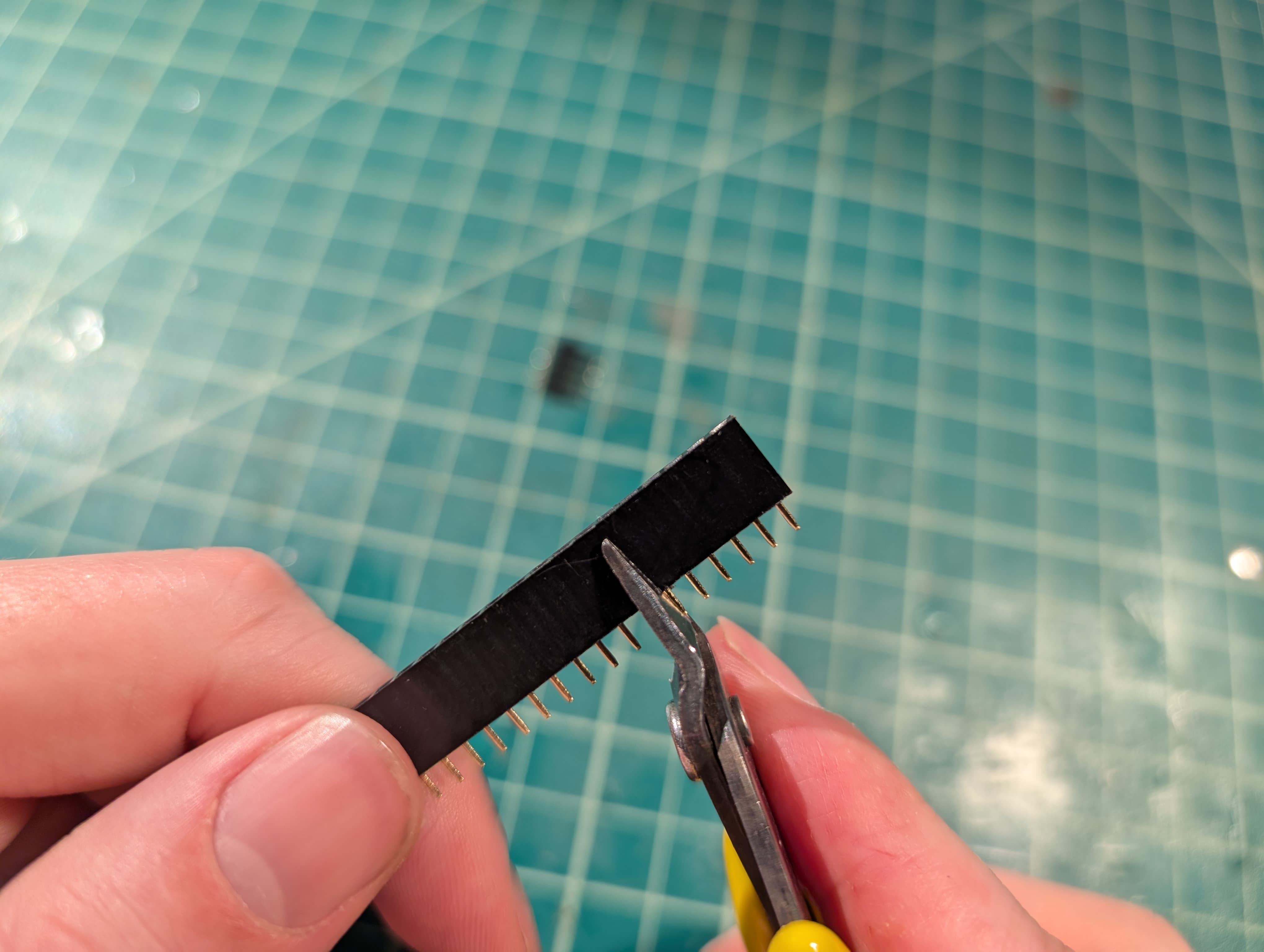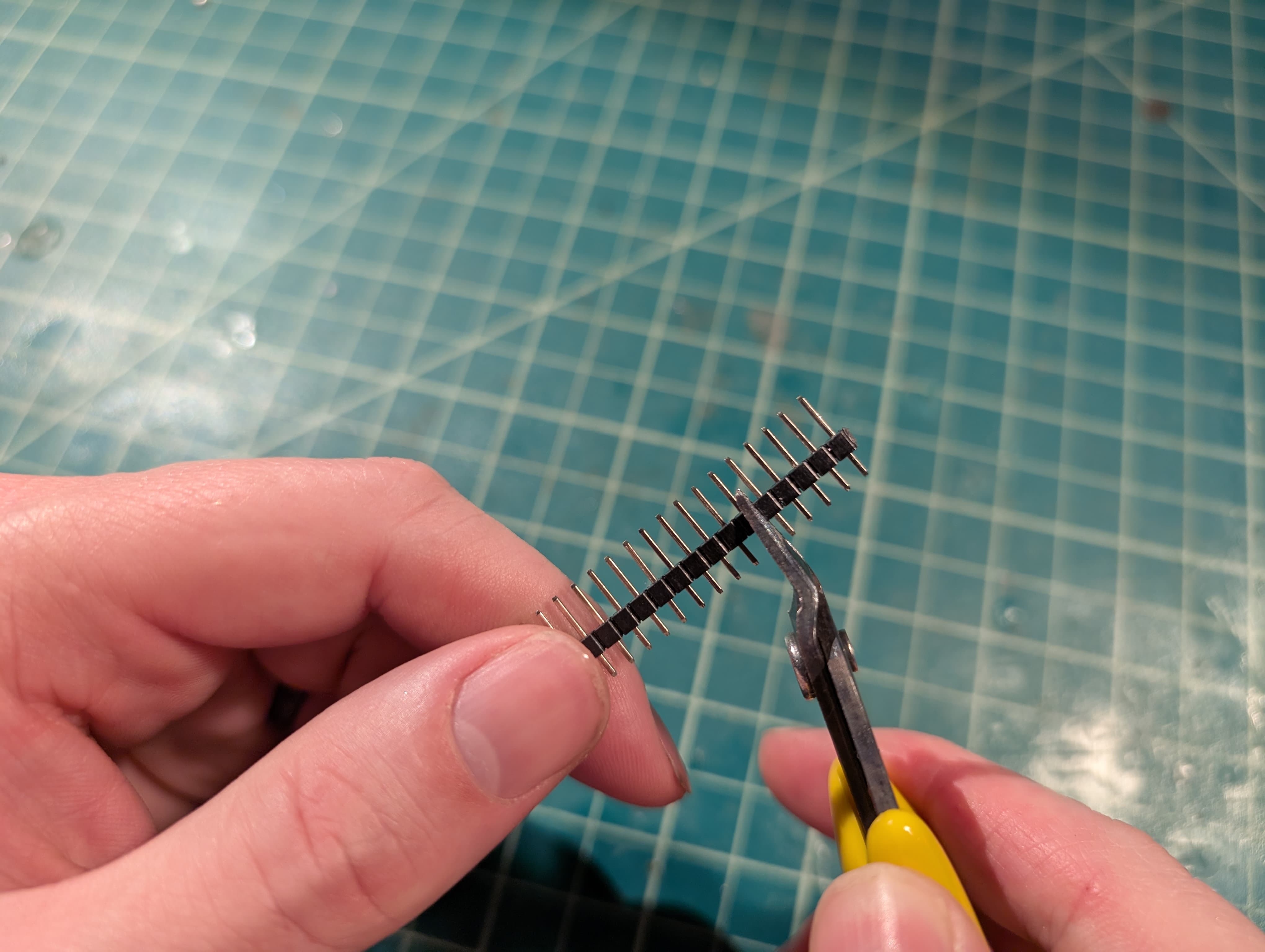 Next we install the male and female headers. If they are not pre-cut, we need to cut them to only have 5 pins. The male header (one with prongs on both sides seen below) can be cut to 5 pins without sacrifices any pins. Cut between the 5th and 6th pins from the end.