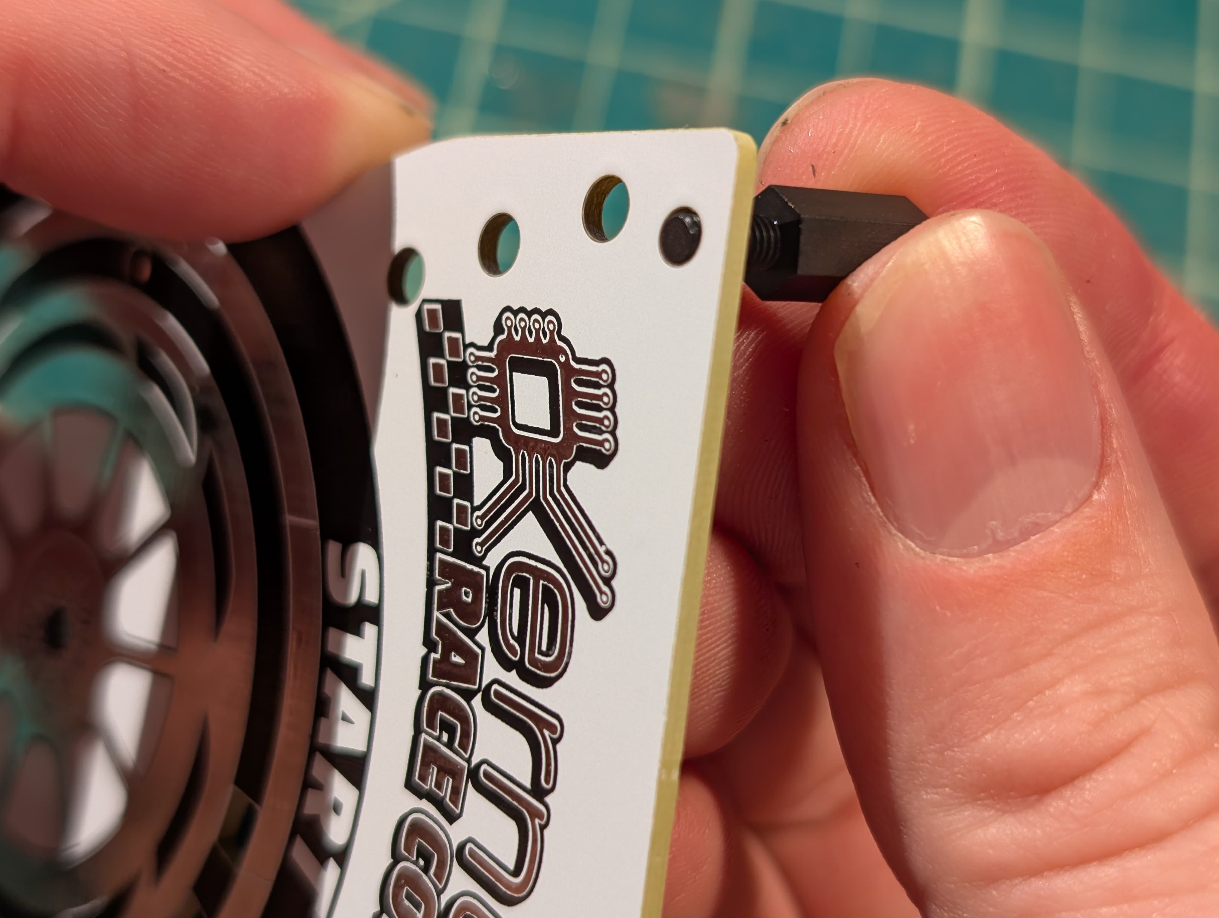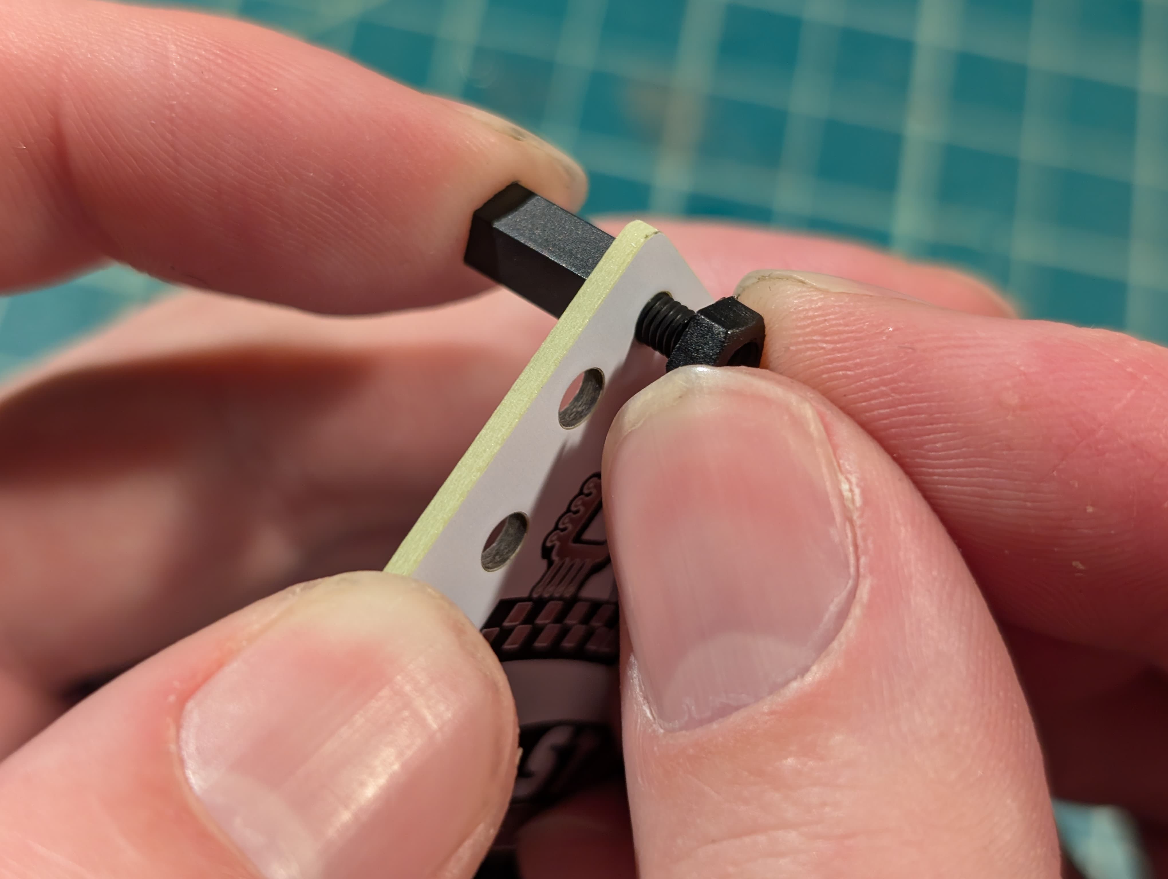 Each bonus track has 3 standoffs to support the track. There are additional holes in the bonus tracks to let the LEDs shine through, so be sure to insert the standoffs in the right holes! Simply insert the standoff from the bottom of the bonus track, and thread the nut on the top side. Finger tight is plenty!