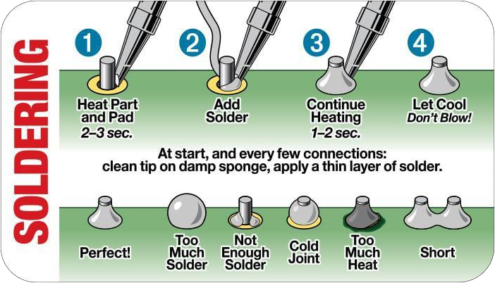 We are now ready to solder! Check out the infographic below for a crash course or a nice review. If you want help, grab a volunteer who will be happy to help!
